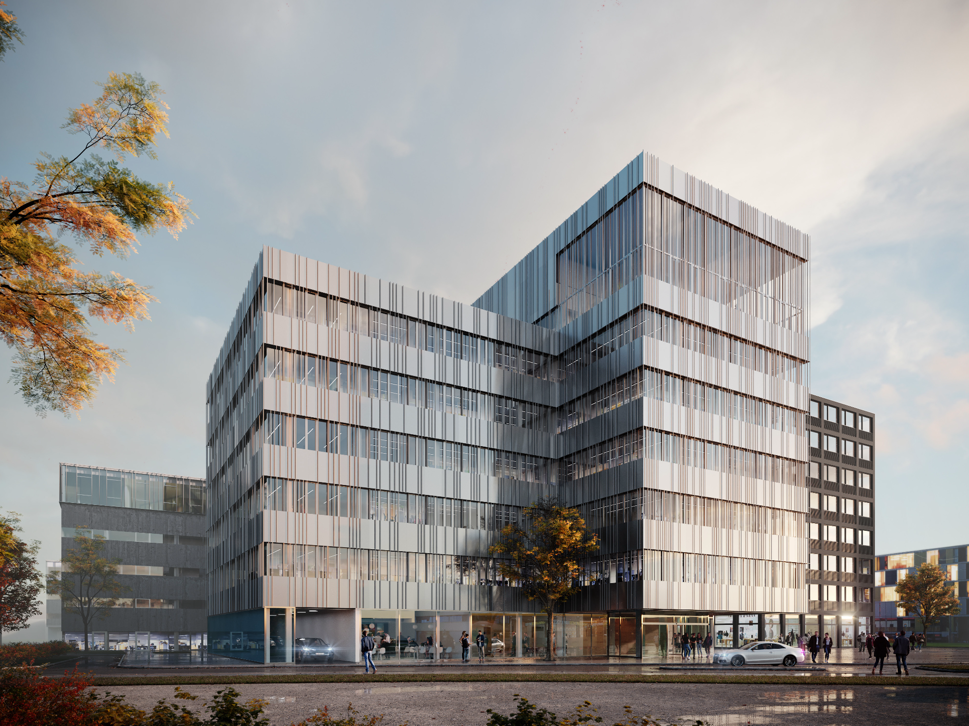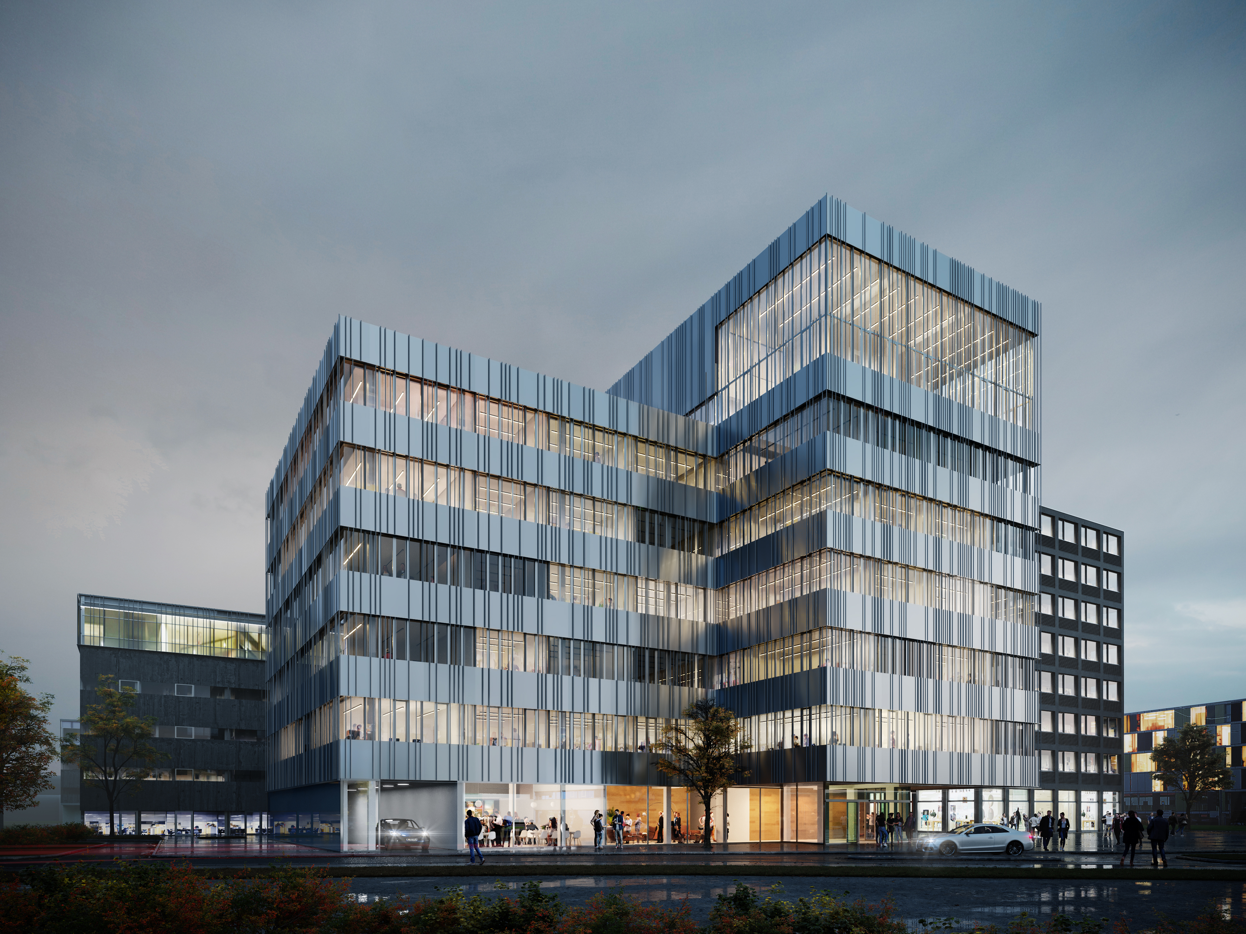 Auch im Inneren setzt das Projekt neue Maßstäbe. Die Innenarchitektur wurde konsequent auf moderne Arbeitswelten ausgerichtet: Hochwertige Materialien, durchdachte Raumstrukturen und flexible Nutzungsmöglichkeiten sollen konzentriertes Arbeiten ebenso ermöglichen wie Austausch und Teamarbeit.