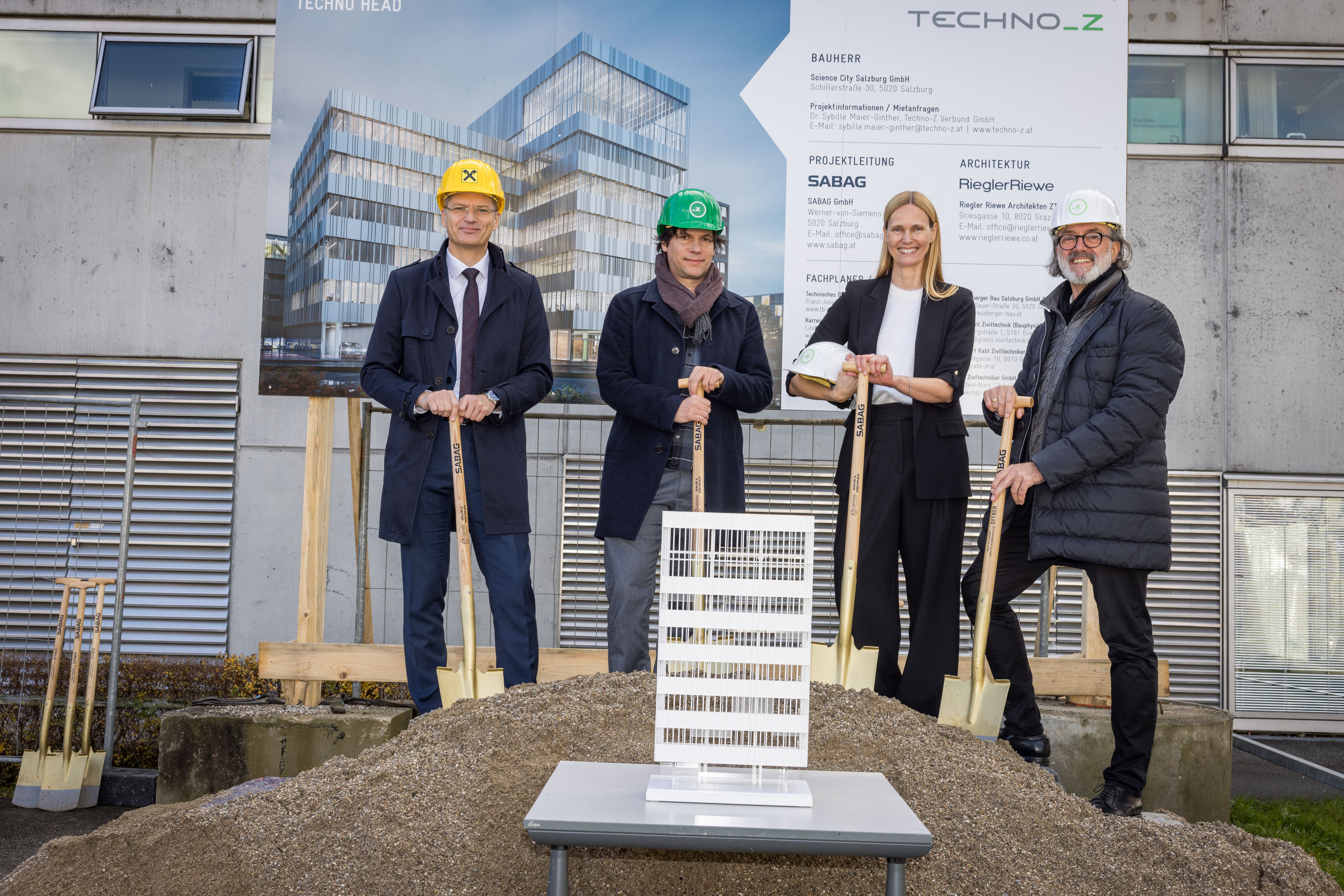 v.l. Andreas Derndorfer, Geschäftsleiter Unternehmenssteuerung Raiffeisenverband Salzburg, Christian Story, Geschäftsführer Riegler Riewe Architekten, Sybille Maier-Ginther, Prokuristin Techno-Z Verbund GmbH, Werner Pfeiffenberger, Geschäftsführer Techno-Z Verbund GmbH (c) wildbild